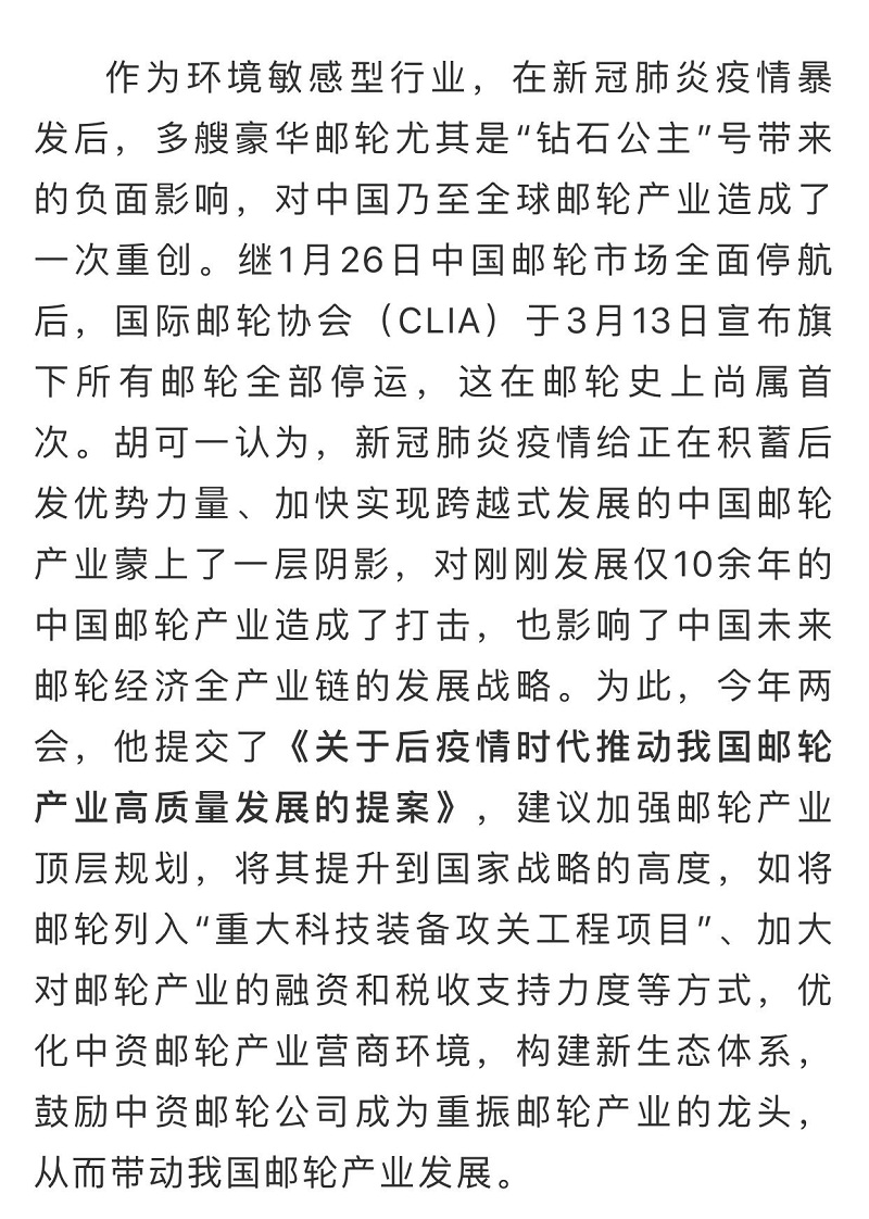 船舶看兩會(huì)| 全國(guó)政協(xié)委員胡可一:審視根本性問(wèn)題,推動(dòng)郵輪業(yè)高質(zhì)量發(fā)展