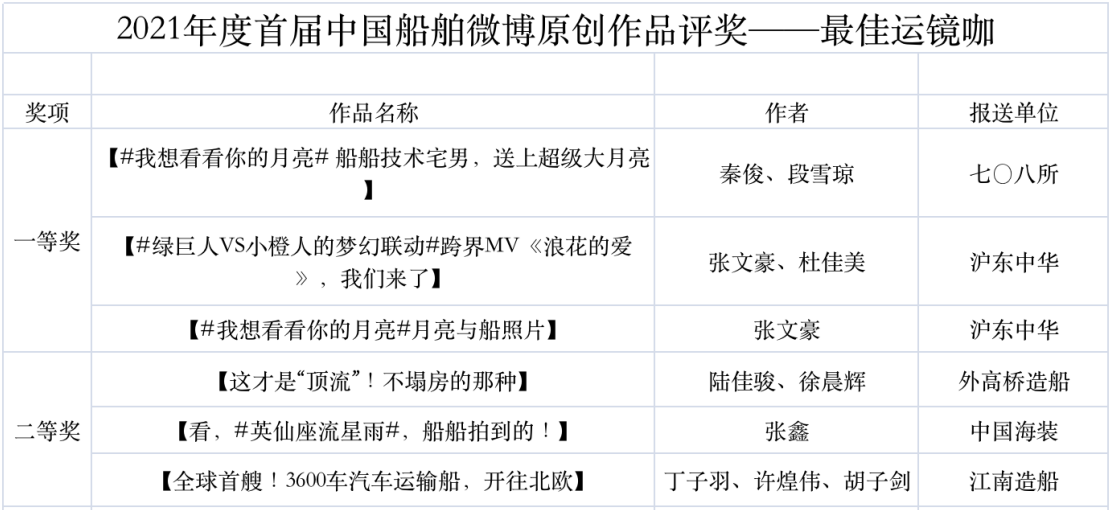 為鼓勵更多成員單位積極加入到中國船舶集團(tuán)新媒體平臺的宣傳中來,在集團(tuán)公司黨群工作部的指導(dǎo)下,中國船舶報社從不同維度,對2021年度各單位支持“中國船舶”微信的力度進(jìn)行了梳理統(tǒng)計,并利用微博政務(wù)的全國專家?guī)煸u審資源,對2021年度“中國船舶”微博原創(chuàng)作品進(jìn)行了專業(yè)評審,評選結(jié)果公布如下: