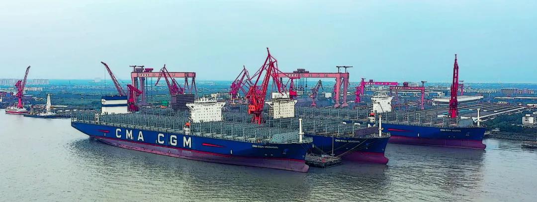 “海上綠巨人”系列箱船是滬東中華近期的重點產(chǎn)品。三艘15000TEU集裝箱船列隊整齊,滬東中華建造團隊開足馬力,奮戰(zhàn)金秋。該型號集裝箱船是當今世界綠色環(huán)保船型,國產(chǎn)化率達到90%,可靈活布置于全球各個重要航線。